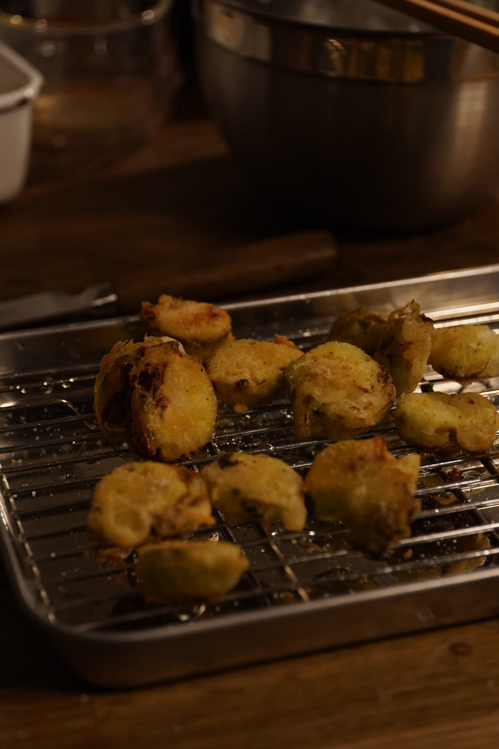 芽キャベツは加熱することで特有の甘みが強まりますが、油で揚げることで外側の衣はサクッと、芽キャベツの中心部は蒸し焼き状態でホクホクとした食感に仕上がります。